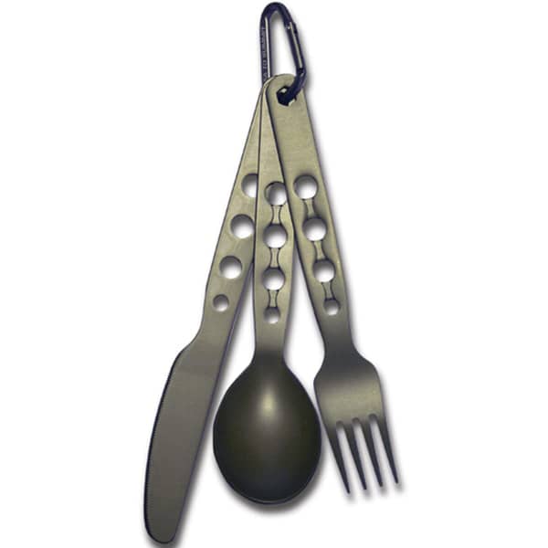 Gemaakt van een T6-legering uit de ruimtevaart, heeft dit bestek een matte aluminium afwerking die de duurzaamheid verhoogt voor een langere levensduur. Nog lichter dan titanium, deze set weegt slechts 37g. Het wordt geleverd met een karabijnhaak om het bestek bij elkaar te houden.